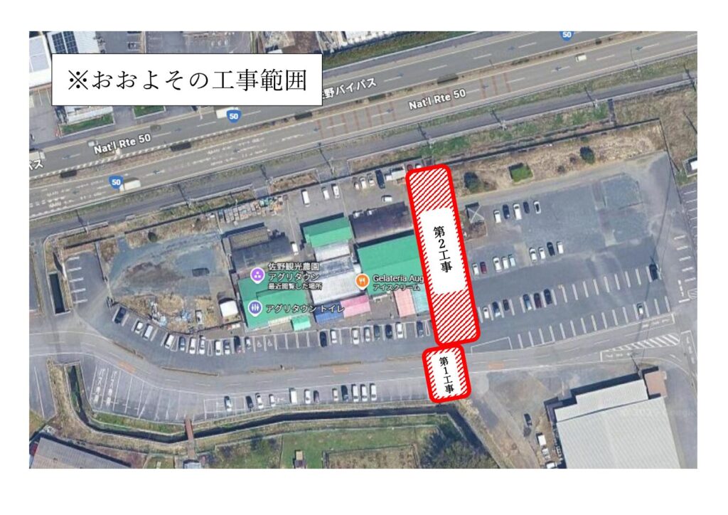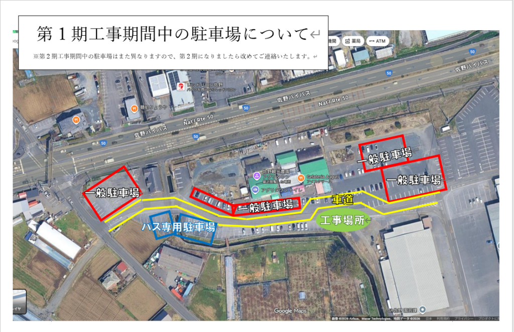 この度、佐野市所有の水路の老朽化による大規模工事が実施されることとなり、工事期間中は駐車場の場所及び施設内までの導線が一部変更となります。